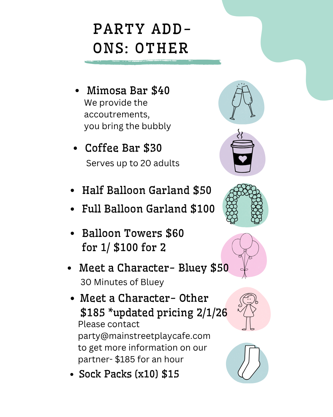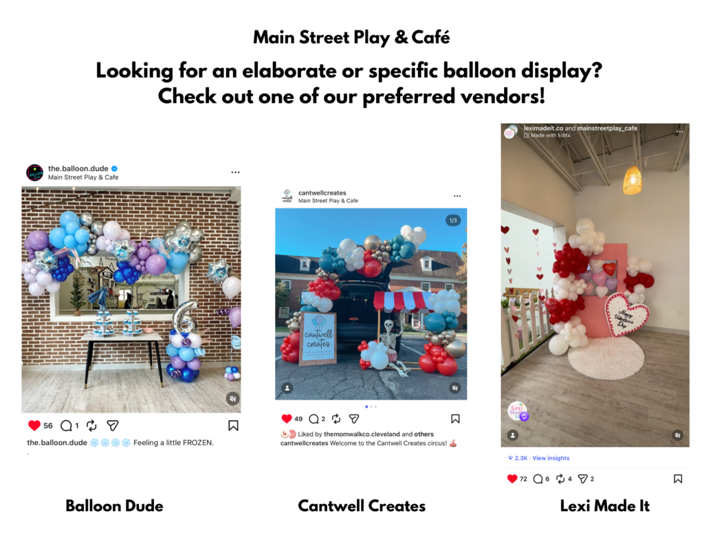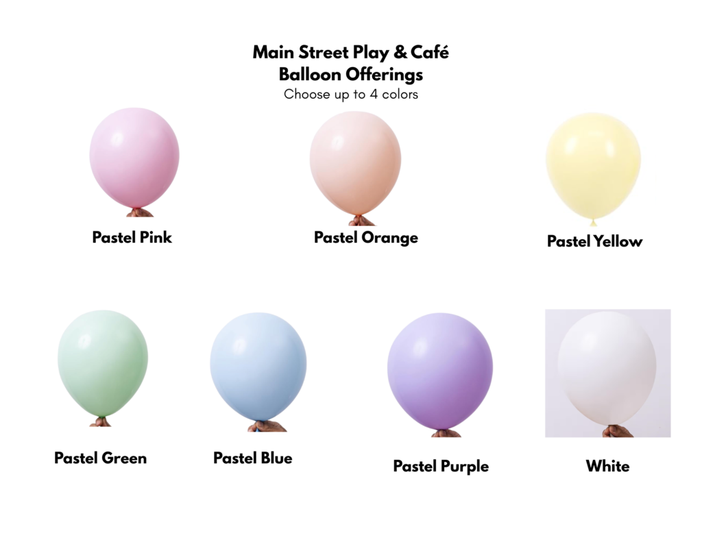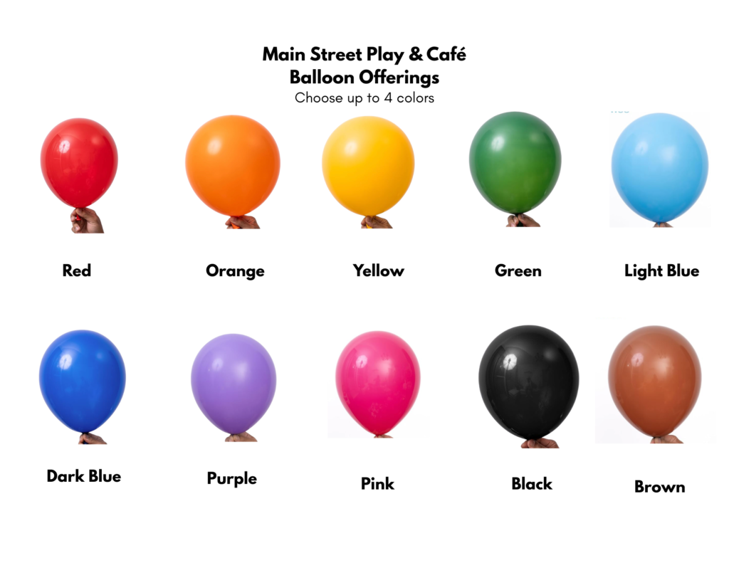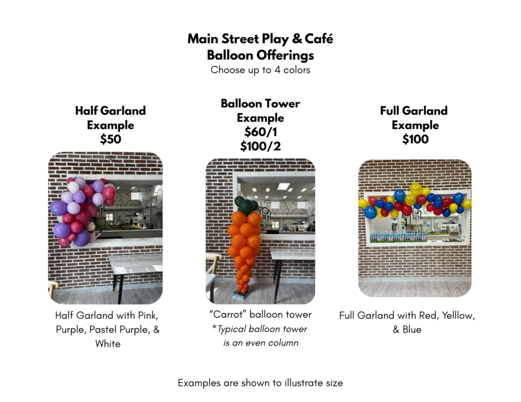 PARTIES Book your event! Balloon Offerings Balloon Dude Cantwell Creates Lexi Made It PARTIES AT MAIN STREET PLAY AND CAFEparty@mainstreetplaycafe.com